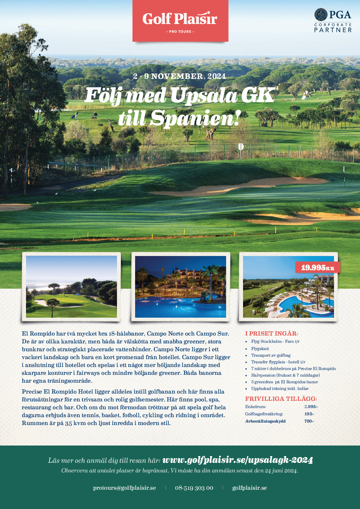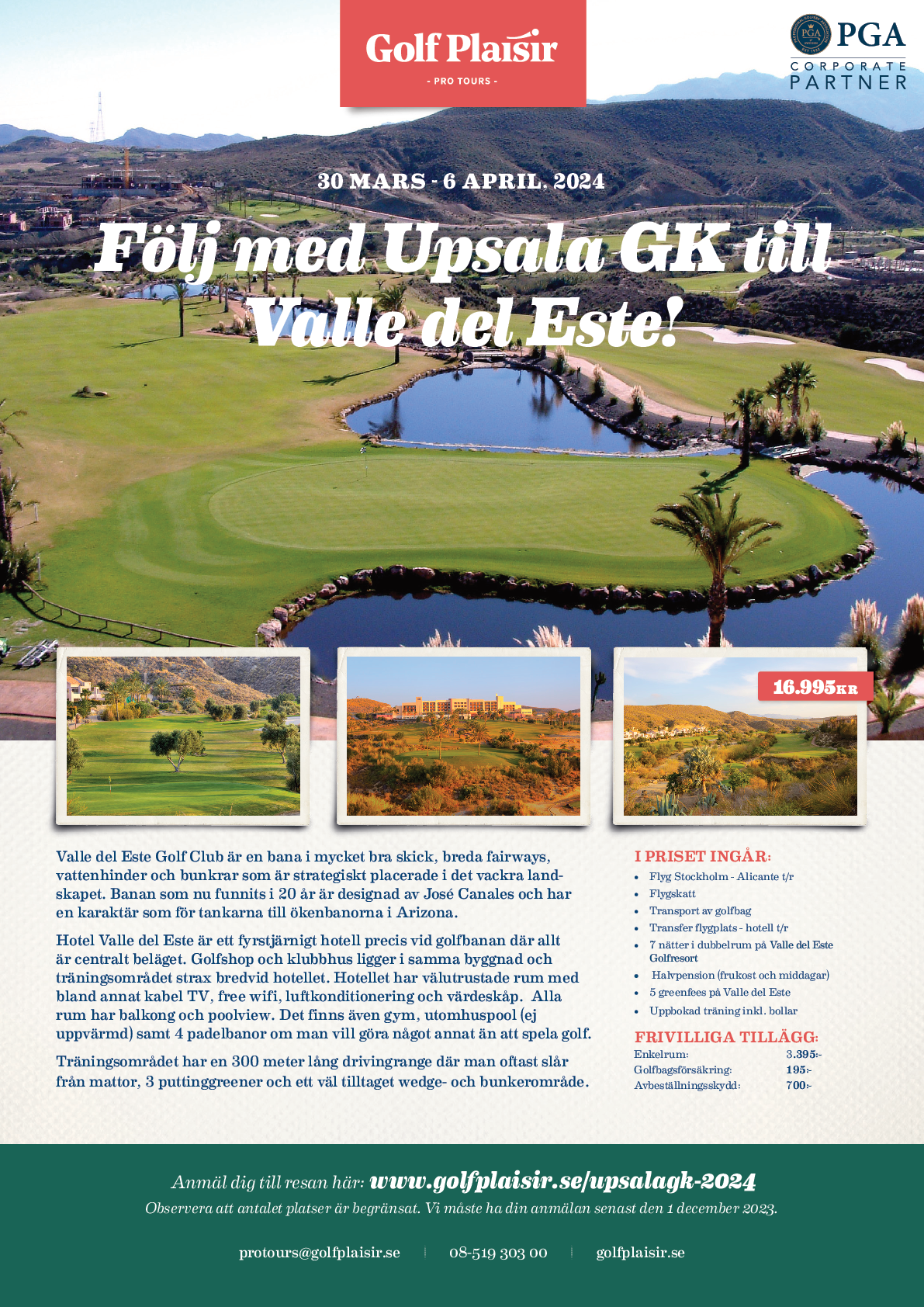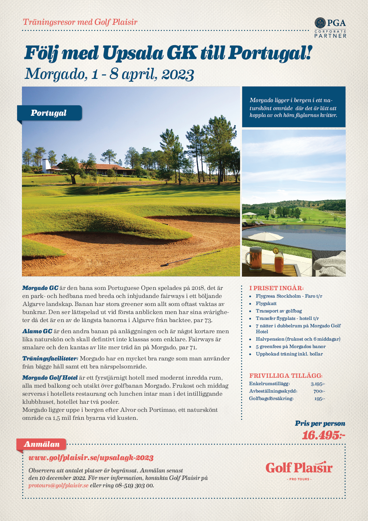 Upsala GK erbjuder inspirerande golfresor tillsammans med klubbens tränare, där utveckling, spelglädje och gemenskap står i centrum. Resorna riktar sig till golfare på alla nivåer och kombinerar träning, spel och upplevelser i miljöer som ger både energi och inspiration.